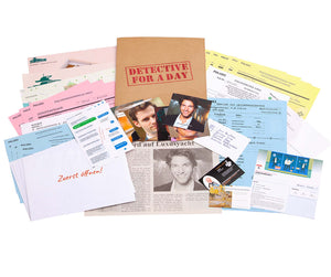 Detective for a Day ist kein Brettspiel. Du bekommst eine Mappe mit etwa 40 verschiedenen Beweisstücken. Zusätzlich zu den Beweisen bekommst du fünf Umschläge, die du nach und nach öffnen kannst, wenn deine Ermittlungen voranschreiten.